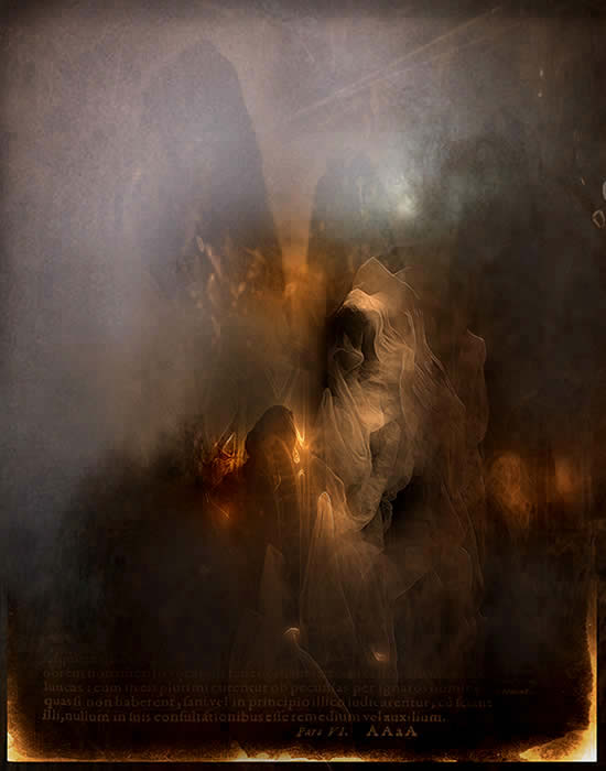 In the distant forest there are waterfalls that whisper your name, and brush up against you, sometimes becoming you when you are distracted and taken unawares. Shadows are always delivering startling messages that, when read from behind, illuminate the background that becomes the foreground, like a studied veil, remote and yet strangely familiar. The filigree is a burning tree like a long forgotten ancestor. The fire, soft and alien, aligns its bright cubicles in triangles of dusk, one upon the other.