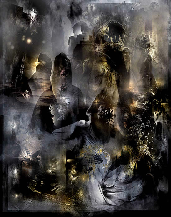 She reaches for the key of misplaced objects (above, left) and intercepts the one who secretly loves her (extreme right), with a glance off the edge of the door, like a waterfall surrounded by subtle crimes. The fortune-teller fondles the slave girl (behind, center) to gain access to the mysteries (glowing in the foreground), while the magician remains illusive and sinister (to her near left) and always in the dark. She, as usual, is most playful and prophetic (as she moves slowly behind the wedding couple.) He, on the other-hand, is growing transparent in his desire for her, and dangerous in this aspect of his greed. They all regain their composure, for one brief moment, when the light changes from black and white to illumination.